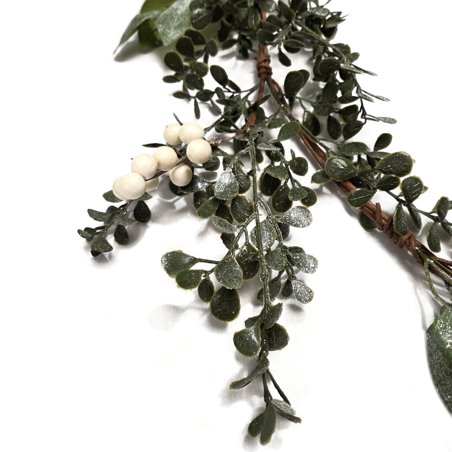 - Classic frosted boxwood foliage and white berries
